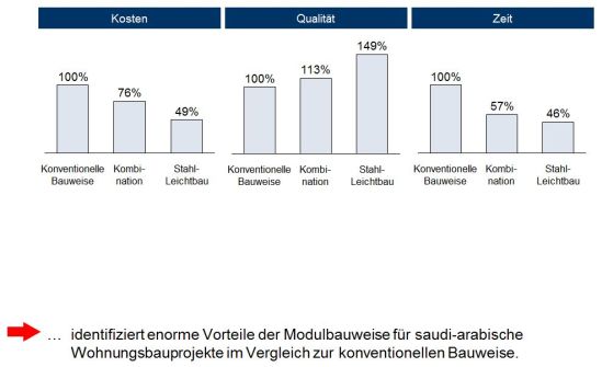 Aufgrund des steigenden Bedarfs an kurzfristig realisierbarem Wohnraum, ist der Faktor Zeit ein wesentlicher Treiber des modularen Hausbaus (vgl. Abbildung 2). Mit dem modularen Hausbau können Bauprojekte mehr als 55 % schneller realisiert werden. Zusätzlich wird eine Kostenreduzierung von über 70 % gegenüber der konventionellen Bauweise realisiert. Aufgrund der hohen Wiederholrate können darüber hinaus wesentliche Qualitätsvorteile erreicht werden.
