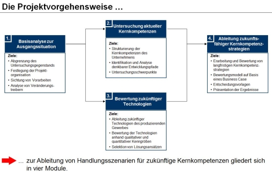 Im zweiten Modul wird das aktuelle Kernkompetenzportfolio des Kunden untersucht. Die Kernkompetenzanalyse umfasst dabei alle relevanten Bereiche, in denen sich Kernkompetenzen vermuten lassen, d.h. beispielsweise die Produkt- und Produktionstechnologien, die Prozesslandschaft oder auch die Unterstützungsfunktionen des Unternehmens. Die genauen Untersuchungsbereiche müssen im Projekteverlauf abgegrenzt werden. Eine Gegenüberstellung der identifizierten Kernkompetenzen mit den identifizierten Veränderungstreibern, die auf das Unternehmen einwirken, erlauben zu diesem Zeitpunkt bereits erste Rückschlüsse auf die Zukunftsfähigkeit der Kernkompetenzen. Aufbauend darauf werden im weiteren Verlauf des Moduls vom Projektteam in Zusammenarbeit mit Experten aus Wissenschaft und Praxis mögliche Entwicklungspfade der Kernkompetenzen erarbeitet, die als Basis für die Ausgestaltung von langfristigen Kernkompetenzstrategien in Modul 4 herangezogen werden.